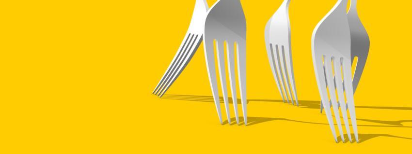 Fork on a yellow background. Forks for the design of a restaurant, cafe, pizzeria. Minimalistic kitchen fork design for advertising purposes