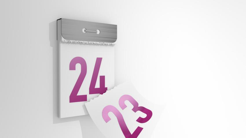 3d rendering of a minimalistic tear-off calendar. 3d illustration of changing days from 23 to 24. Falling page of the past day.