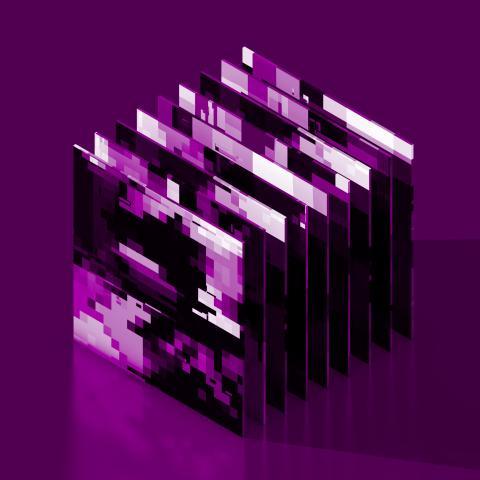 Digital pixels or glitches in the form of square thin purple-colored files are located at a distance in an isometric view with a shadow