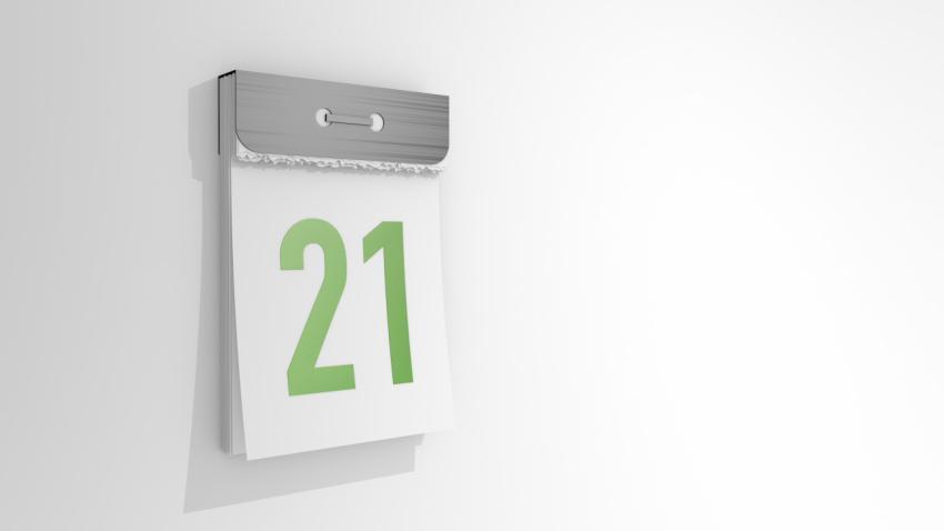 Tear-off calendar number 21. Stylish 3D rendering of the twenty-first date. 3D illustration on white background day twenty one.