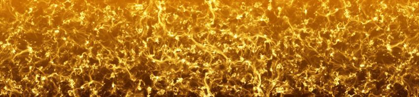 Abstract background of golden color made of thin twisted intertwined threads, like many glowing lightning or flashes in the sun. Illustration.