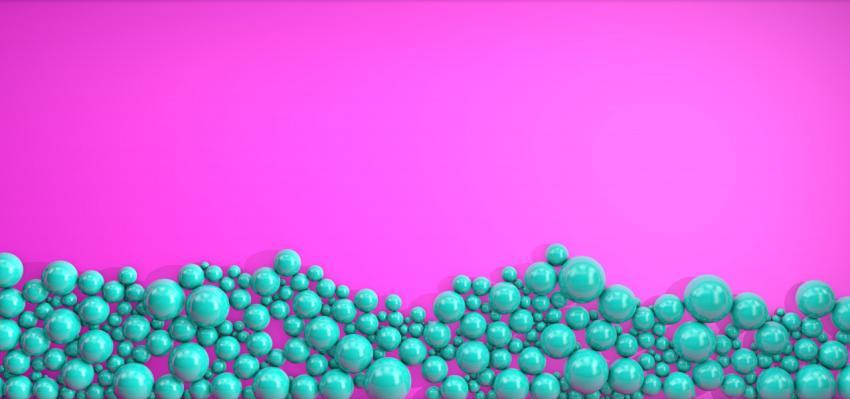 Pearl green balls of different sizes are scattered on a pink background. Modern beautiful background