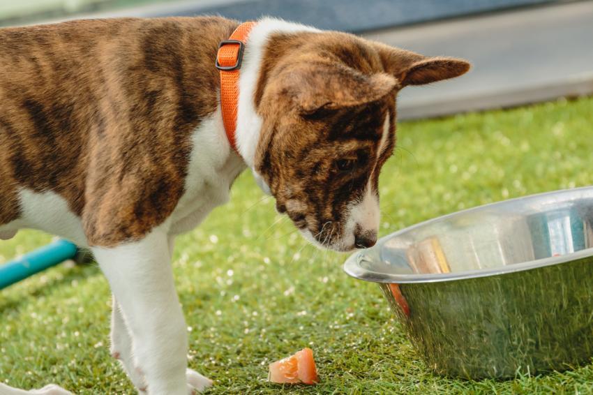 Basenji puppy eating fresh food at home close up