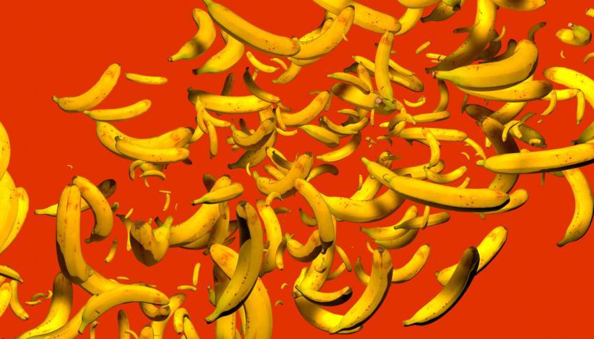 A lot of bananas hanging chaotically on a red background. 3d rendering, 3d illustration.