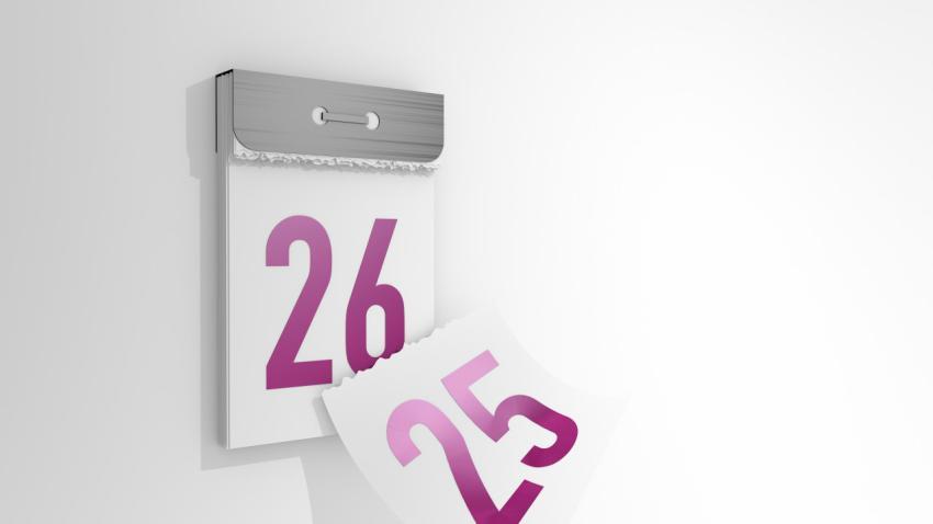 3d rendering of a minimalistic tear-off calendar. 3d illustration of changing days from 25 to 26. Falling page of the past day.