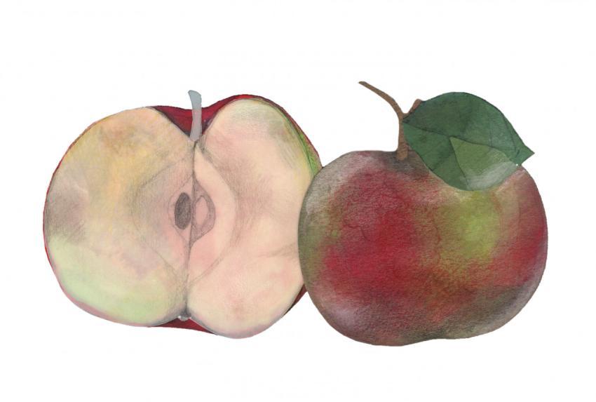an illustration of a red and green apple and a half in collage, watercolor and crayons
