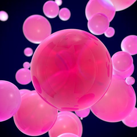 Beautiful pink balls of different sizes with many reflections are located on a deep blue background
