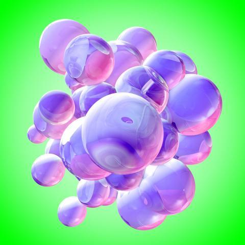 Purple glossy balls are gathered together in the center on a green background