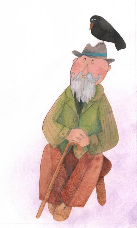 illustration in collage, watercolor and crayons of a grandpa sitting with a crow on his hat