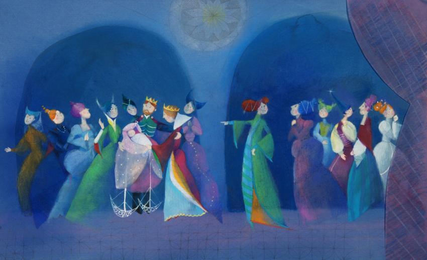 illustration in watercolor and crayons of birth of a little princess