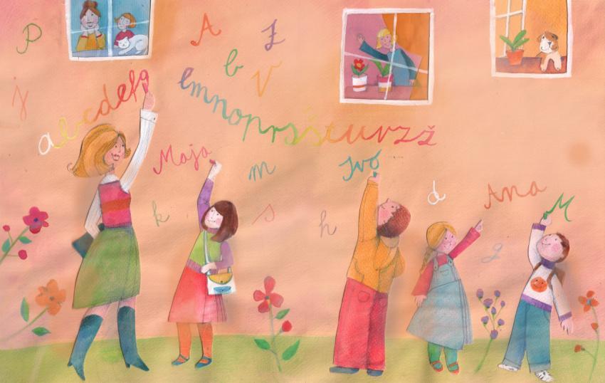 illustration in collage, watercolor and crayons of school children, teacher and letters