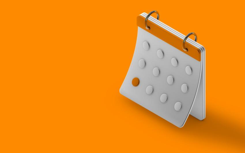 Stylish 3d calendar on a yellow background. Minimalistic design. 3D illustration, 3D rendering.