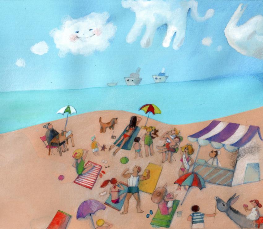 illustration in watercolor, collage and crayons of people on the beach watching funny clouds