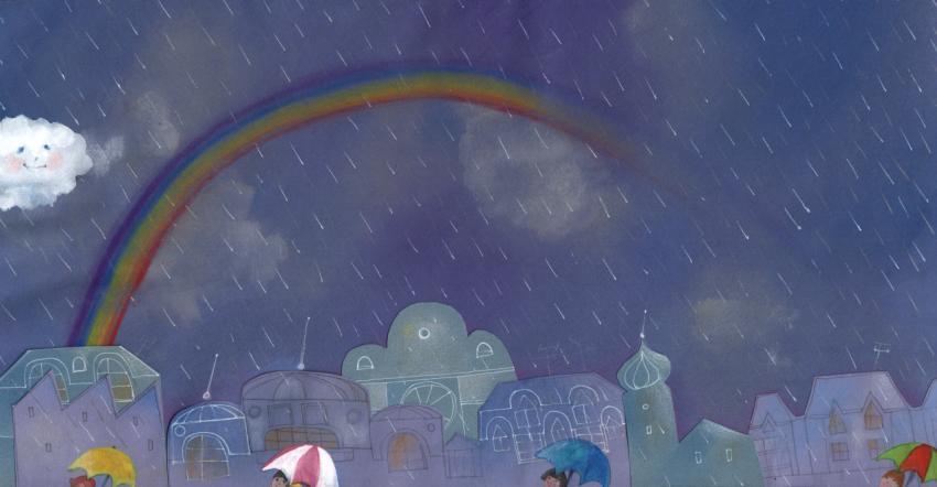 illustration in collage, watercolor and crayons of rain and rainbow above the city