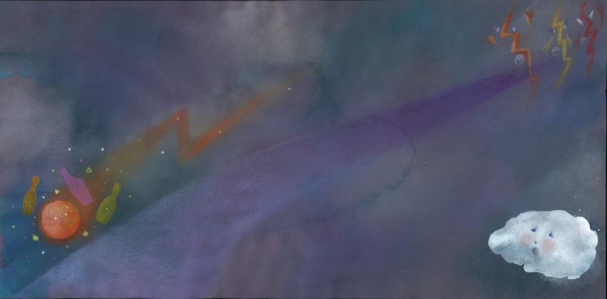 illustration in collage, watercolor and crayons of lightnings bowling in the sky