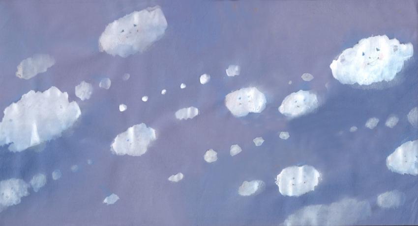 illustration in watercolor and crayons of violet blue sky with happy fluffy white clouds