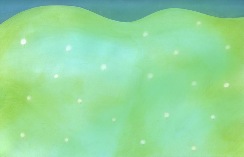 illustration in collage, watercolor and crayons of a background of light green meadow with small white flower pattern
