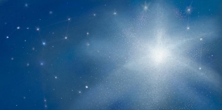 illustration in watercolor and crayons of shining supernova in the blue universe
