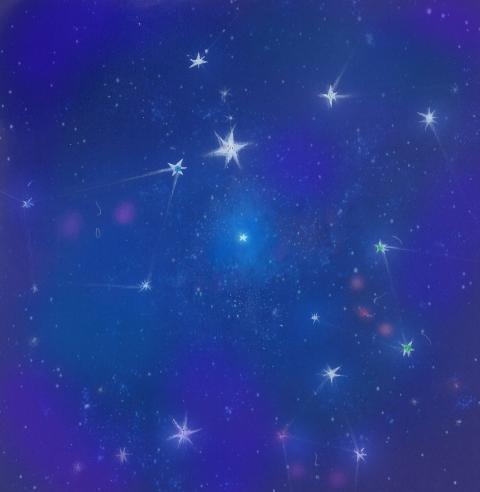 illustration in watercolor and crayons of a little blue star and constellations in deep blue universe