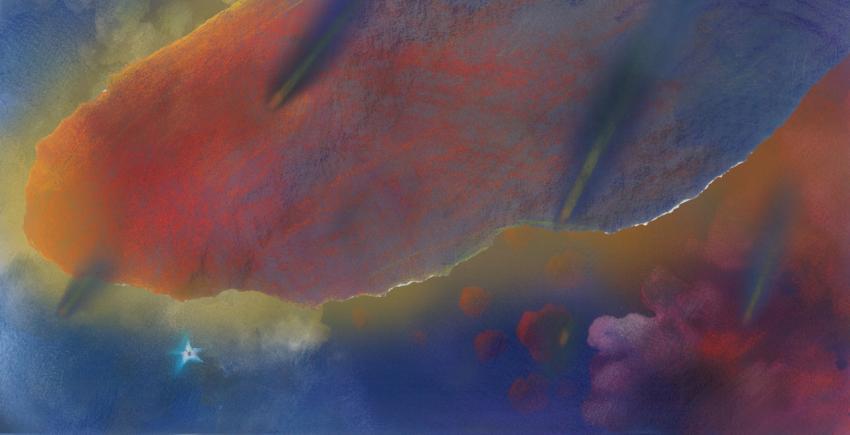 illustration in collage, watercolor and crayons of a big flaming asteroid emerging through space