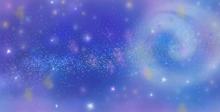 illustration in watercolor and crayons of spiraling fogs in the starry, glowing universe