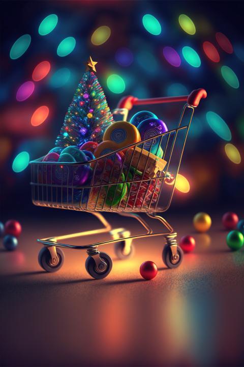 A supermarket trolley with wheels filled to the brim with colored gifts, soft toys, sweets, stands on a beautiful gradient floor with a slight reflection, serpentines and bright colored balls are around, against the defocused Christmas tree and Christmas lights, Depth of Field