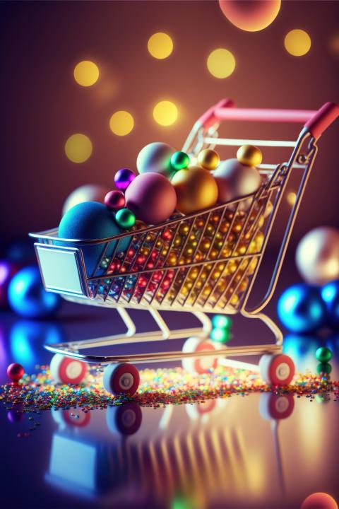 A supermarket trolley with wheels filled to the brim with colored gifts, soft toys, sweets, stands on a beautiful gradient floor with a slight reflection, serpentines and bright colored balls are around, against the defocused Christmas tree and Christmas lights, Depth of Field