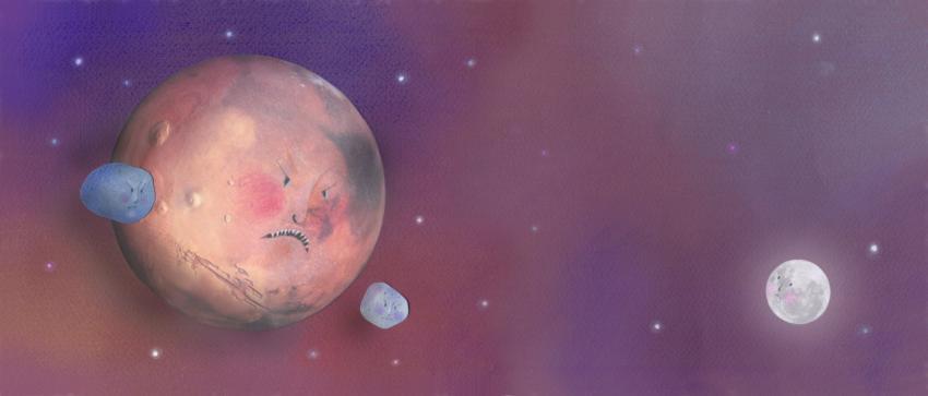 angry Mars and his moons meeting Moon in the red universe