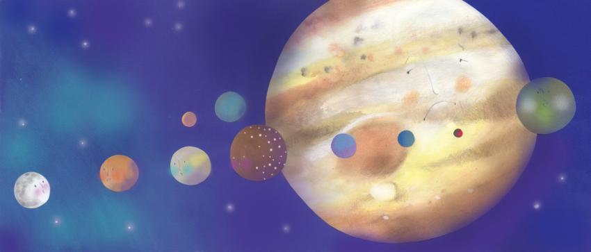 illustration in collage, watercolor and crayons of Jupiter and his moons in a deep blue universe