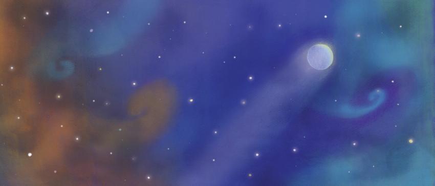 illustration in collage, watercolor and crayons of Moon glowing and traveling through starry colorful universe