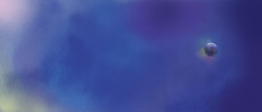 illustration in collage, watercolor and crayons of Moon smiling and traveling through deep blue and colorful universe