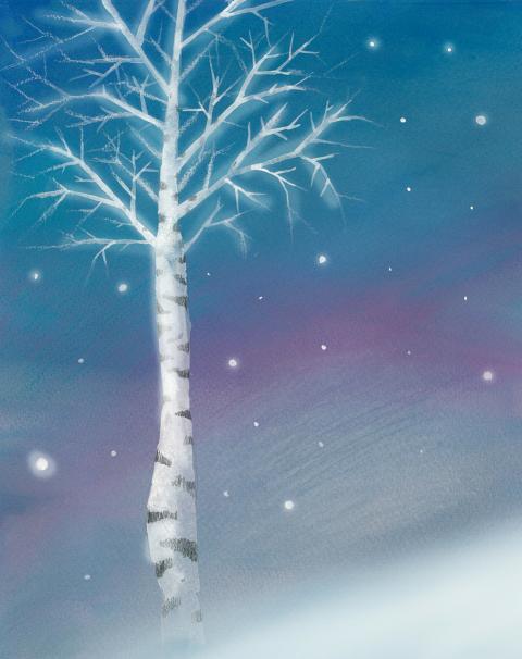 illustration in watercolor and crayons of a birch tree in the blue snowy night