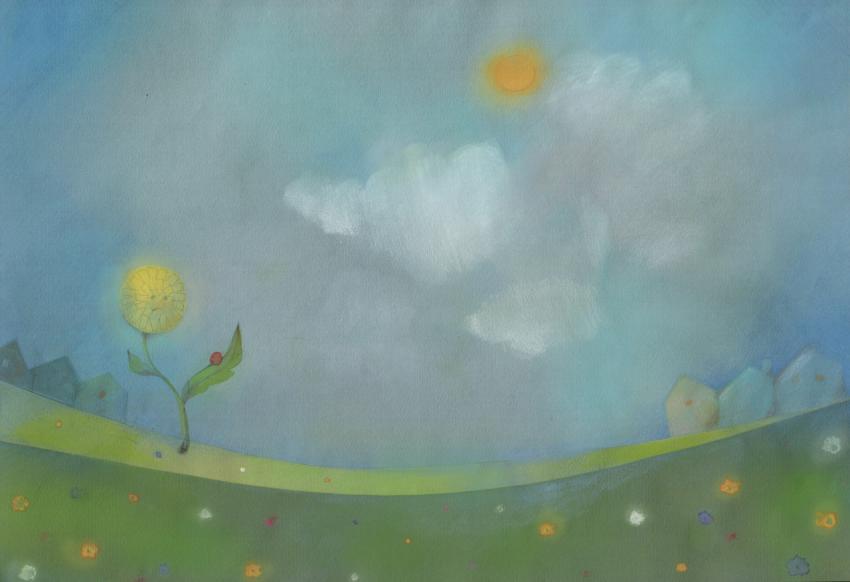 dandelion yellow flower ladybug meadow field green grass spring countryside outdoor nature landscape colorful sun sky bright sunshine illustration collage crayons watercolorSimilar Photos