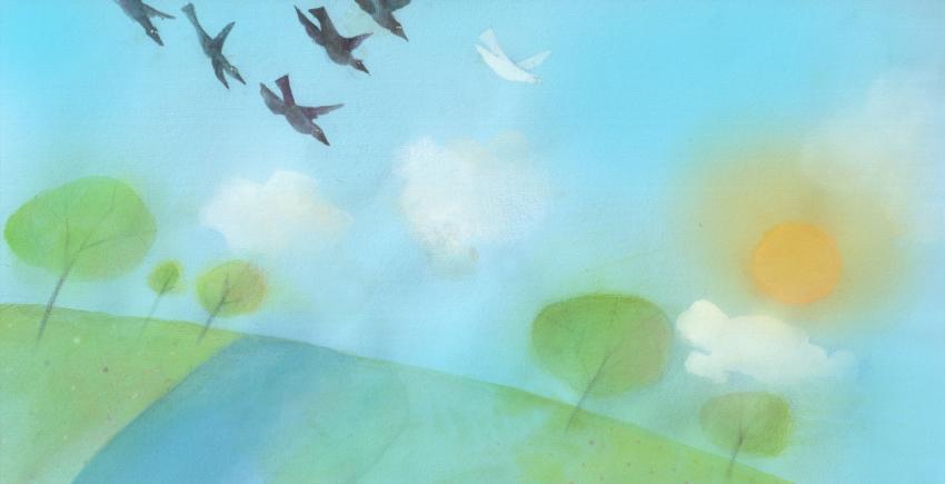 illustration in watercolor and crayons of sunny landscape with river, meadow, trees, clouds, blue sky, black crows and a white one