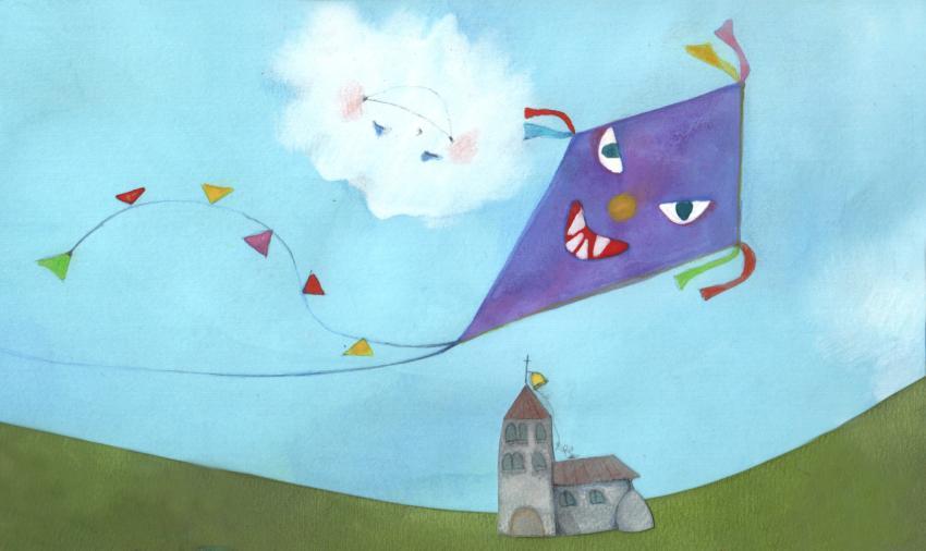 illustration in collage, watercolor and crayons of fluffy white cloud and a kite playing above the church