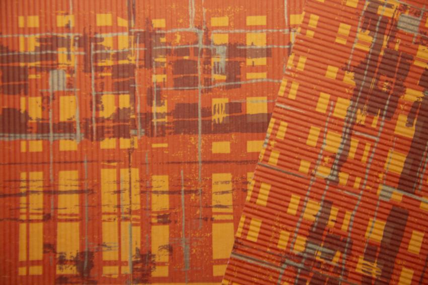 Two sheets of corrugated thick paper lie on top of each other. Sheets painted orange-red-cinnamon