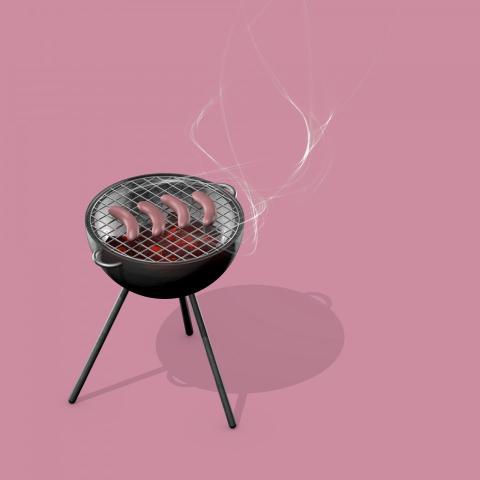 Grill with smoke on a pink background with four sausages. 3D illustration, 3D rendering