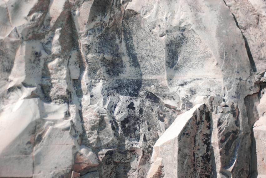 Texture of an old gray wall surface with deep cracks and tattered green paint