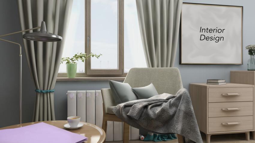 Mock up modern interior of the living room. Armchair by the window. 3D render