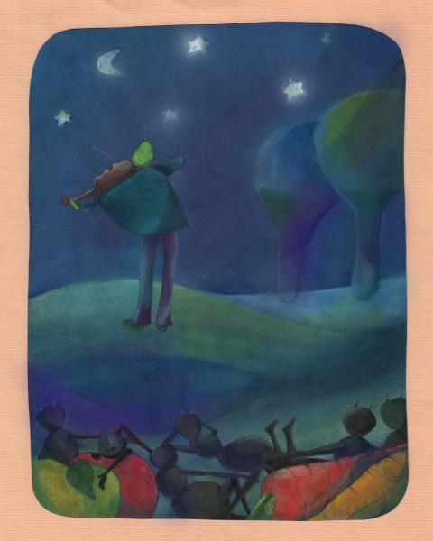 illustration in watercolor and crayons of cricket playing violin in a starry summer night and ants listening