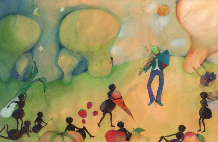 illustration in watercolor and crayons of cricket playing violin in a spring twilight and ants listening after summer harvest