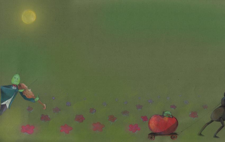 illustration in watercolor and crayons of cricket playing a violin and ant carrying an apple on flowery green background