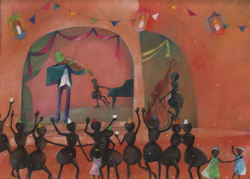 illustration in watercolor and crayons of ants having a party on cricket`s concert