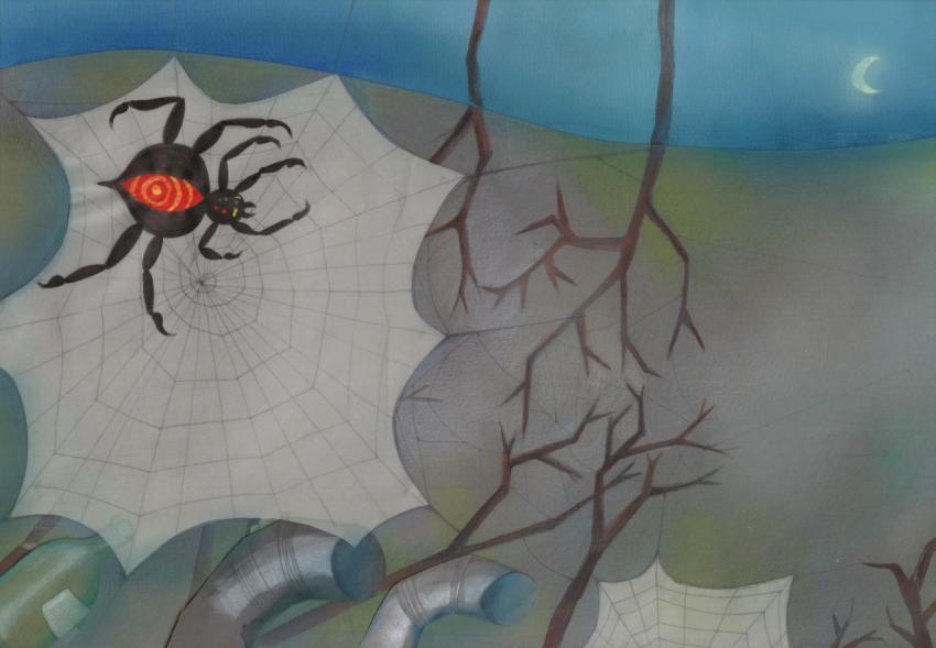 spider insect web animal branches bare grey night garbage junk dangerous scary dramatic illustration collage watercolor crayons colorful bright gloomySimilar Photos