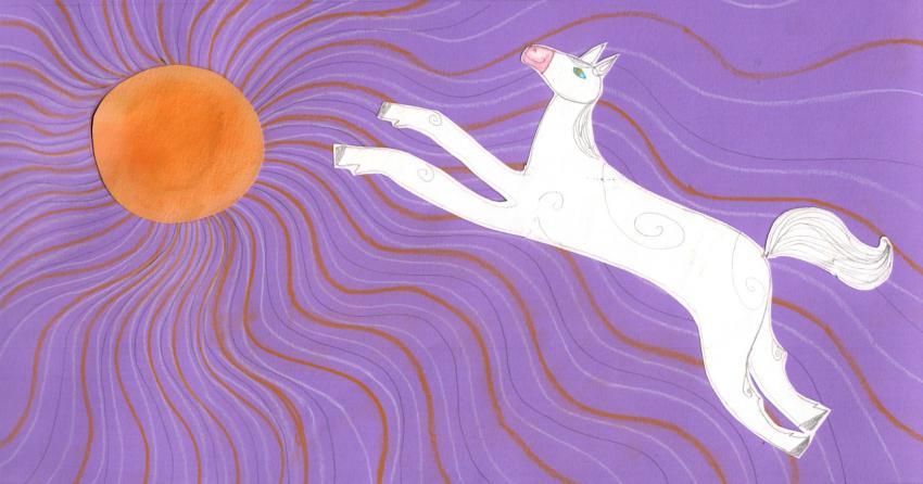 illustration in collage, watercolor and crayons of white horse on a violet background with radiant sun