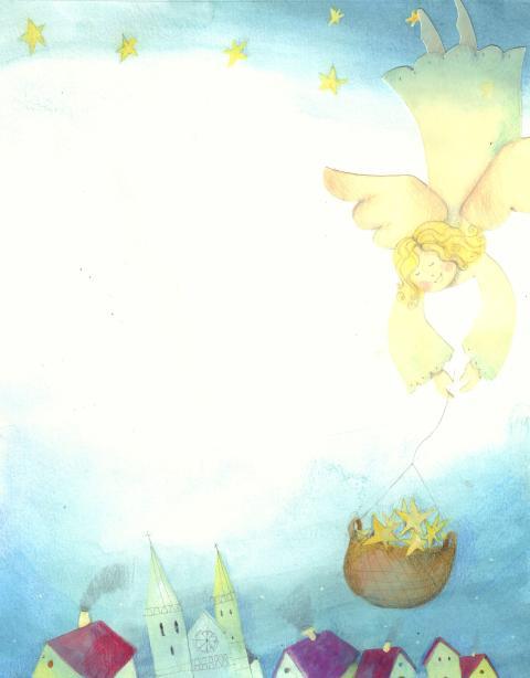 illustration in collage, watercolor and crayons of angel descending above the city with a basket full of stars