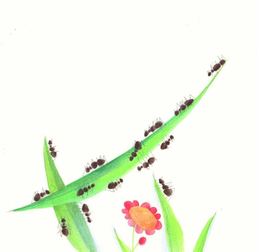 illustration in watercolor and crayons of ants on a grass blade and a flower