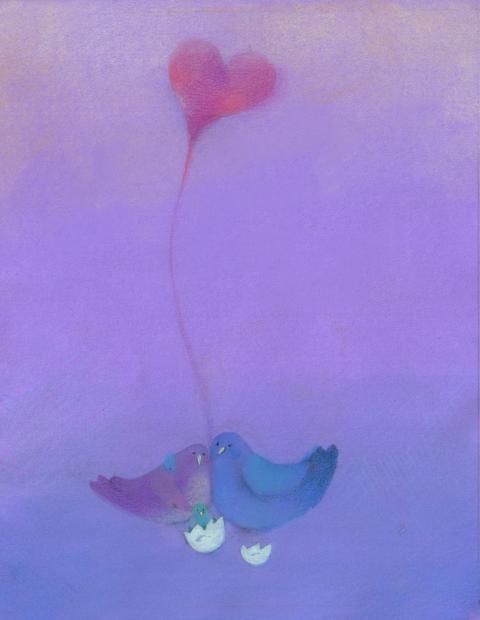 illustration in watercolor and crayons of lovebirds with their newborn baby on a violet background