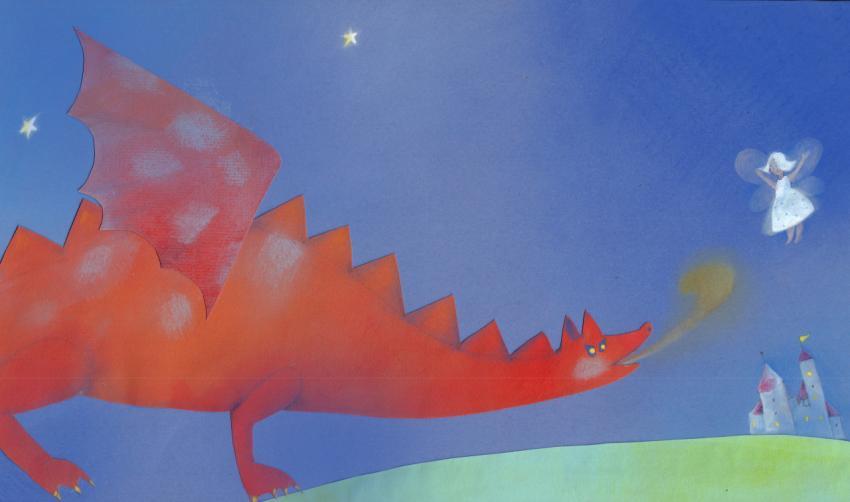 illustration in collage, watercolor and crayons of red dragon and a fairy