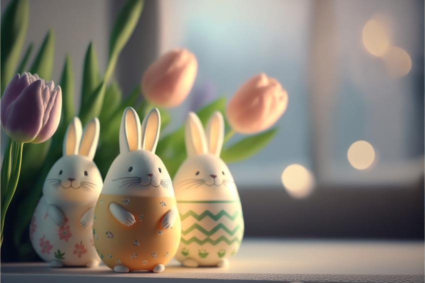 Easter bunnies in the form of eggs and tulips, photo realistic illustration